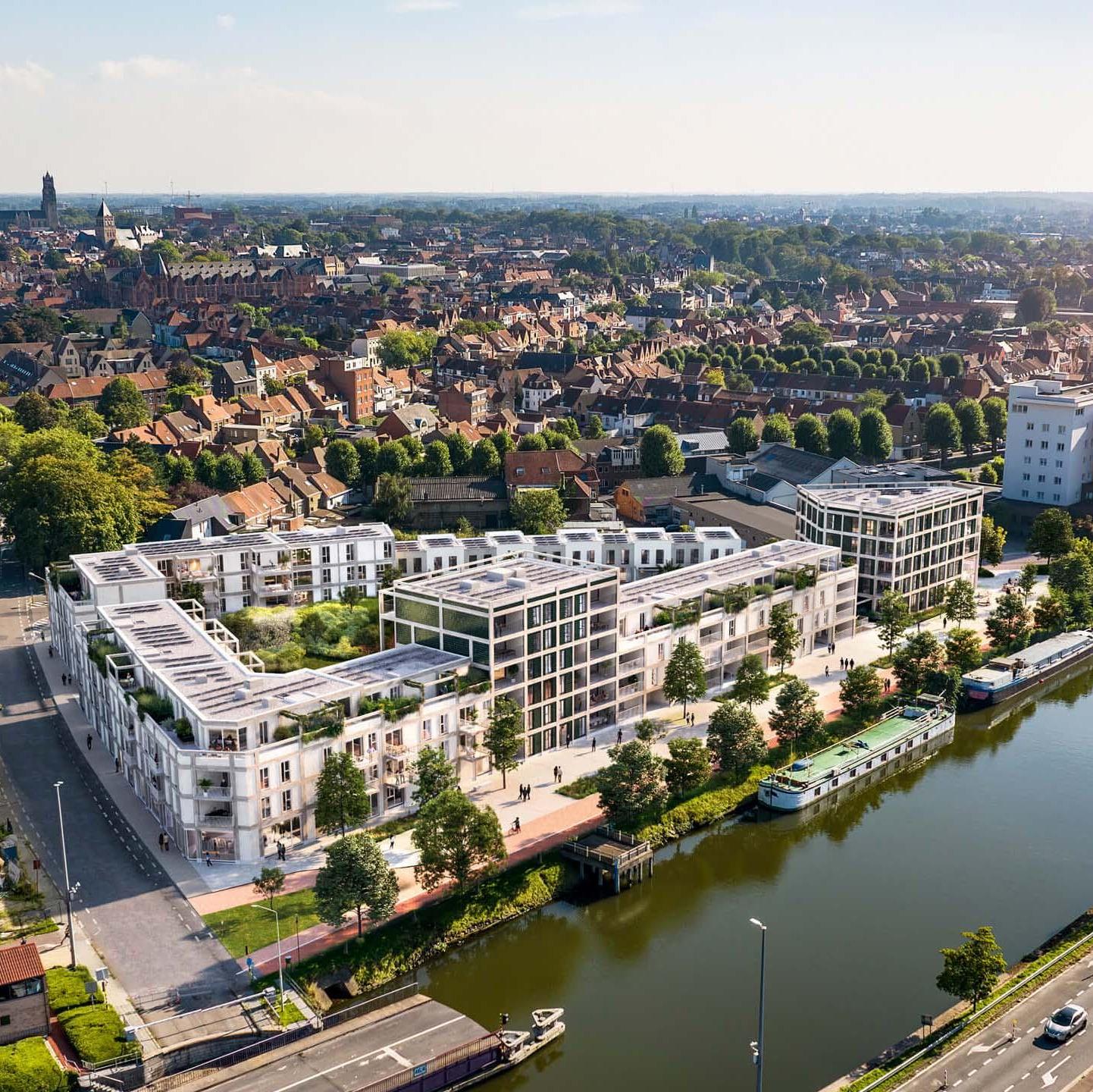 MarckPoint, Van Marckes vastgoedafdeling, werkt samen met Van Marcke Engineering. Dat team is gespecialiseerd in duurzame energieoplossingen en technische berekeningen, en zorgt ervoor dat het Brugse woonproject voldoet aan de hoogste normen voor energie-efficiëntie. De collega’s van Van Marcke Prefab spelen dan weer een belangrijke rol door kant-en-klare energiemodules en HVAC-installaties te leveren, waarmee we heel wat tijd besparen. Van Marcke richtte bovendien speciaal voor dit project een Energy Service Company (ESCO) op in samenwerking met Beauvent. Wat dat precies inhoudt? Er worden heel wat innovatieve en duurzame hernieuwbare-energietechnieken toegepast, zoals een eigen warmte- en koeltenet, zonnepanelen, laadpalen enzovoort.